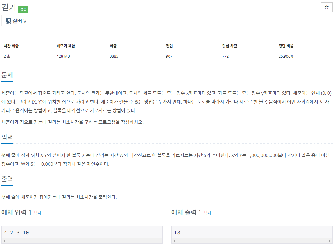 세준이는 학교에서 집으로 가려고 한다. 도시의 크기는 무한대이고, 도시의 세로 도로는 모든 정수 x좌표마다 있고, 가로 도로는 모든 정수 y좌표마다 있다. 세준이는 현재 (0, 0)에 있다. 그리고 (